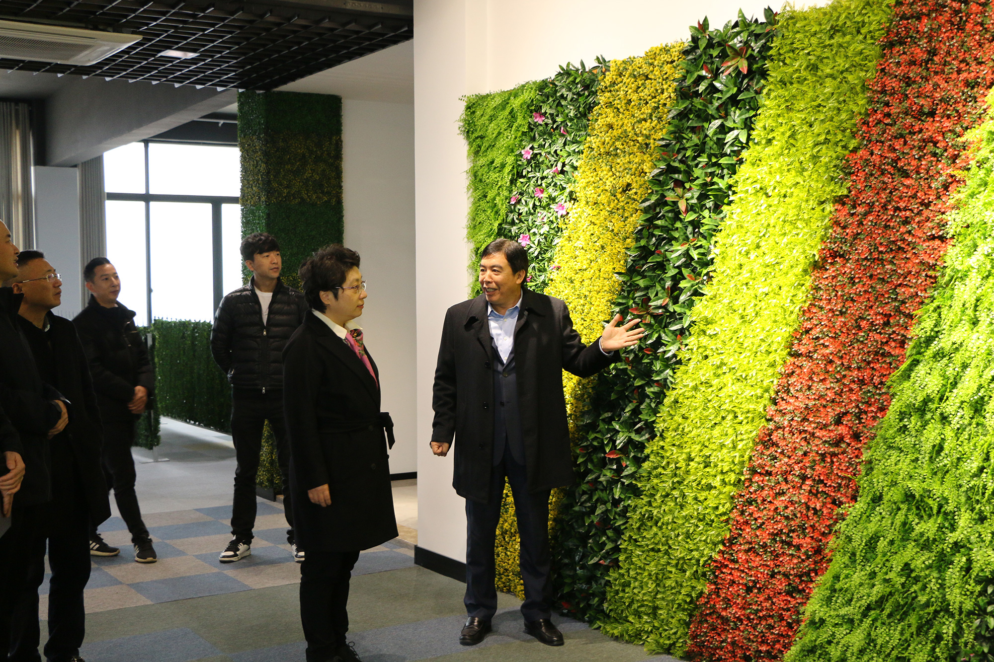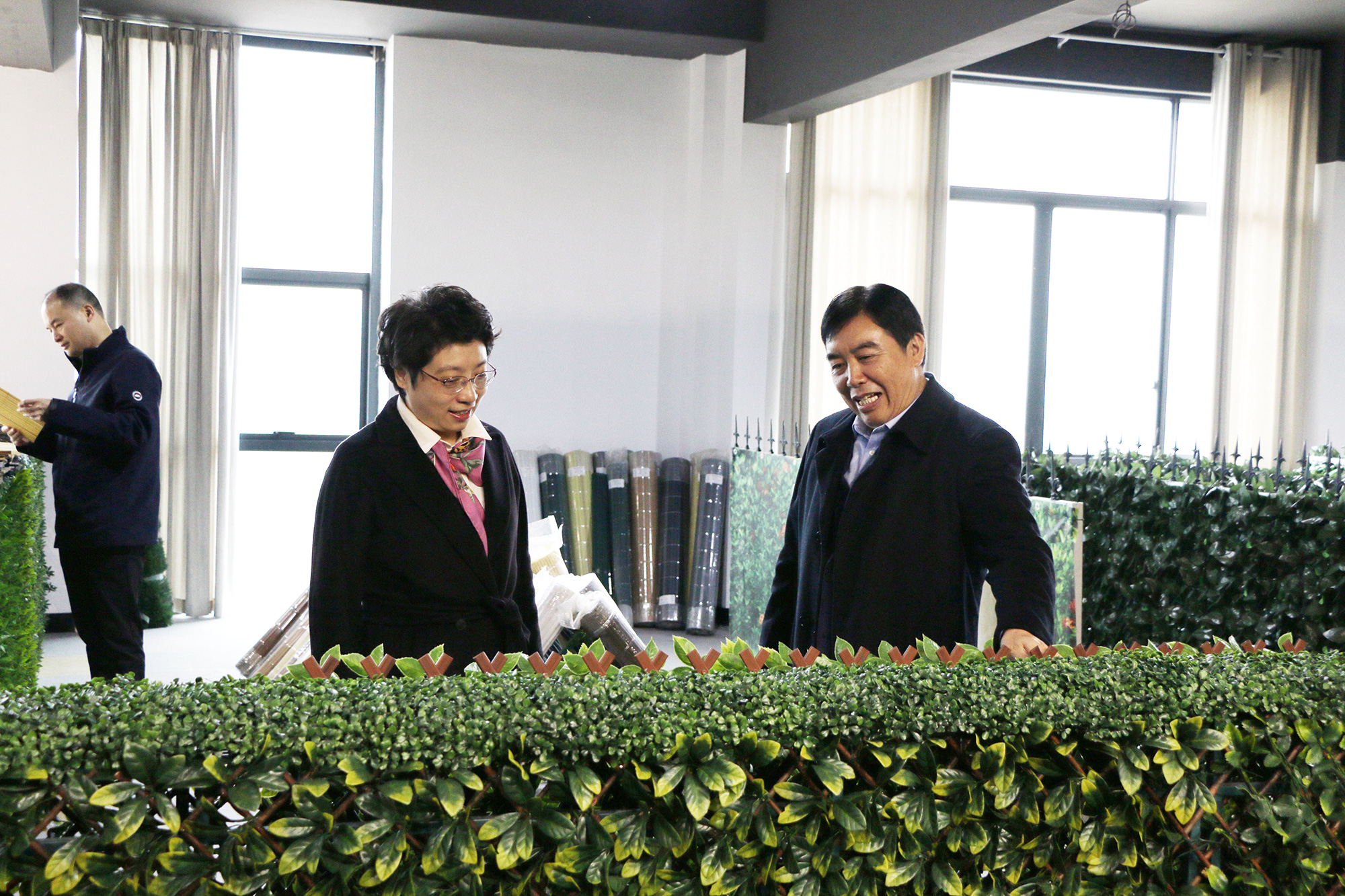 徐董事長(zhǎng)為楊縣長(zhǎng)介紹了明筑公司的發(fā)展近況和仿真植物墻仿真樹葉籬笆產(chǎn)品